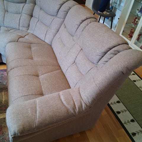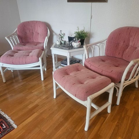 Fåtölj, soffa med schäslong och bord med glasskiva. Bordet kan även användas som pall. Stått inomhus på altan. Säljes utan dynor.