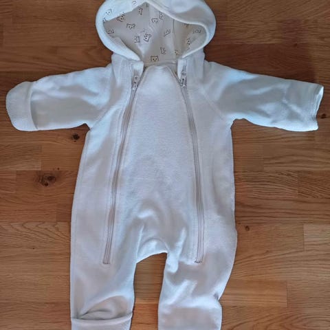 Rikiki fleeceoverall för barn i storlek 56. Overall i beige fleece med huva och integrerade fötter, unisexmodell. Dubbla dragkedjor framtill för enkel av- och påklädning. Passar som ytterlager för spädbarn vid svalare väder.