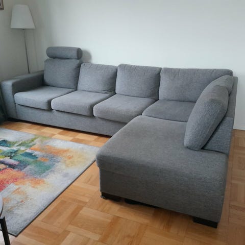 Rejäl hörnsoffa i väldigt fint skick, säljes pga flytt. Hade den fått plats på det andra stället hade vi behållt den!