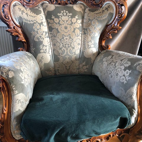 Nyomklädd och stoppad fåtölj i blå sammet och ljust trä. Jätte fint skick (säljer pga inte passar i vår lgh)