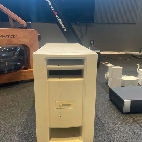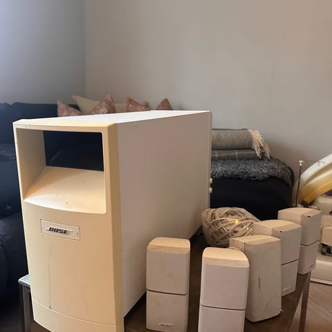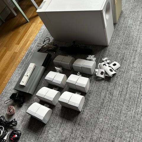 Bose Acoustimass 10 serie III-högtalarsystem i vitt. Systemet består av en större basenhet/subwoofer samt 5 mindre satellithögtalare. Kablar för anslutning medföljer enligt bild.