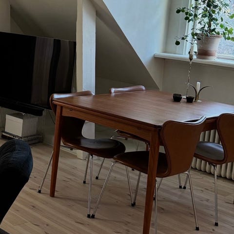 Fint matbord av teak med en förlängningsskiva som kan förvaras under bordsskivan när den inte används. Längd 125 cm, bredd 83 cm, höjd 73 cm. Extraskivan är 59 cm lång. Benen kan skruvas av för enklare transport. Bordet finns på Södermalm vid Zinkensdamm.