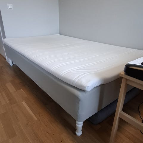 Ikea Snarum säng, 120x200, inklusive ben med Wellpur Gold T65 bäddmadrass. Sängen är en resårbotten från Ikea i beige färg. Bäddmadrassen Wellpur Gold T65 från Jysk är 120x200 cm och cirka 8 cm tjock, i vit färg.
