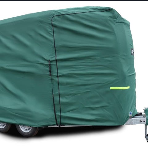 Husvagnsskydd i grå färg. Skyddet täcker hela husvagnen, inklusive sidor och tak. Avsett för att skydda husvagnen mot väder och smuts vid förvaring eller längre stillastående perioder. Lämpligt för användning på uppställd husvagn med stödben.
