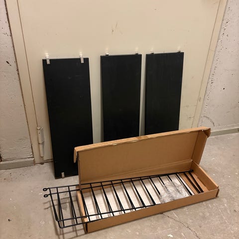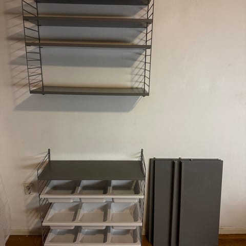 Säljer en stringhylla i ek och svarta gavlar.