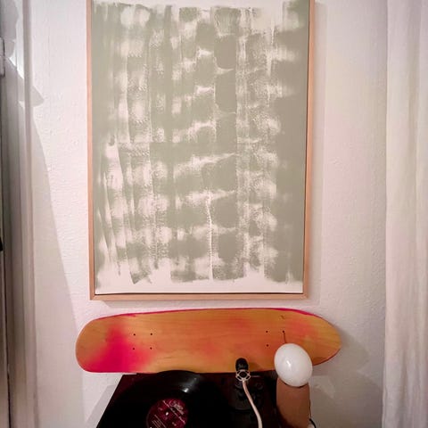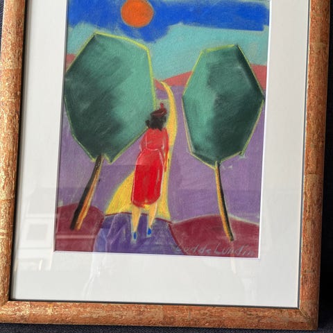 Tavla med abstrakt motiv föreställande tre gestalter mot blå och gröna bakgrundstoner med gula detaljer. Målningen har tydlig struktur i färgen och är signerad i nedre hörnet. Verket är inramat i en träram med innerlist i ljus ton. Baksidan har upphängningsanordning med ståltråd. Passar som väggdekoration i exempelvis vardagsrum, hall eller kontor.