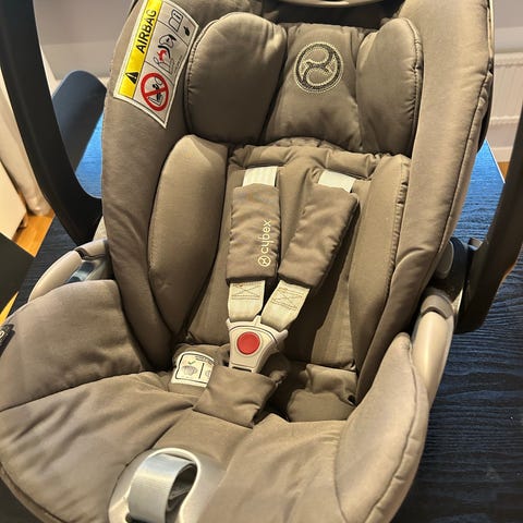 babyskydd för barn upp till 13 kg. Babyskyddet monteras bakåtvänt i bilen och är avsett för spädbarn. Det har bärhandtag, internsele och vadderad insats för extra stöd. Passar användning i bil tillsammans med bas (synlig på bilderna) eller med bilens bälte, beroende på modell och godkännande. Färgtonen är mörk med ljusare detaljer. Lämpligt som första bilstol från nyfödd upp till cirka 13 kg, enligt tillverkarens rekommendationer och gällande säkerhetsföreskrifter.