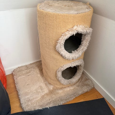 Kattmöbel i modulform med flera sammanlänkade hus i svart färg. Varje modul har utskurna öppningar formade som kattansikten samt runda öppningar på sidorna som gör det lätt för katten att gå emellan. Konstruktionen är anpassad för katter som vill leka, gömma sig eller vila i en avskild plats inomhus. Möbeln placeras på vägg och kan kombineras med andra kattillbehör i hemmet.