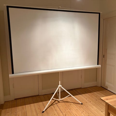Perfekt om man vill ha hemmabio-känsla eller använda projektor för film, sport eller presentationer. När duken är uppe syns den knappt eftersom den sitter i en vit kassett.