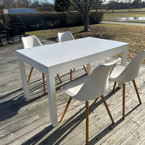 Köksbord IKEA Ingatorp, vitt. Två stolar ingår också med sittdynor. På andra sidan av bordet finns en självhäftande krok som nog går att ta bort om man inte vill ha den. Säljes på grund av flytt, och hämtas av köparen.