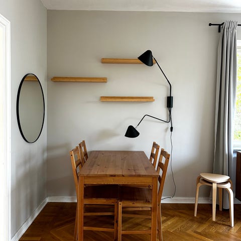 Mycket fint skick på det stora hela men några ytliga smårepor här och var. Bordet har en lite längre repa (se bild) som är ytlig och enkelt kan slipas ner och lackas över. På ena stolen har en liten flisa skavts av på baksidan av ryggstödet (se bild).