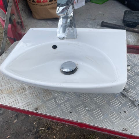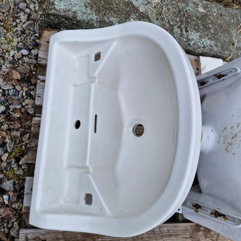 Inga sprickor eller avslag i porslinen. Kranarna är slitna men går att polera upp. Klassisk modell med kedja för propp och bräddavlopp i bakkant. Monteras på vägg. Märkningar finns i porslinet enligt bilderna.
