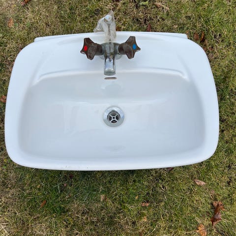 Vitt tvättställ från Ifö, troligtvis 1940-talet, i porslin med två separata kromade kranar för varm- och kallvatten.