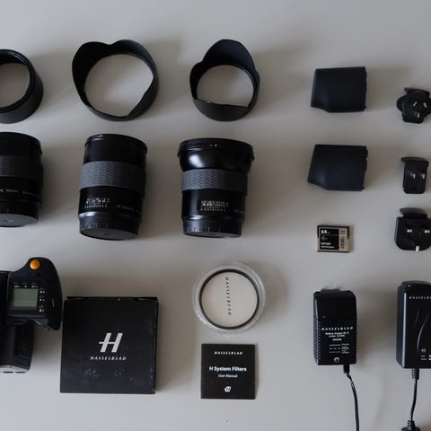 Hasselblad H5D-50c mellanformatskamera med digitalt bakstycke 50c. Kamerahus och bakstycke är avsedda för professionell mellanformatsfotografering. Utrustningen på bilderna inkluderar kamerahus, objektiv, motljusskydd, kamerarem, batterier, laddare, kablar, lock och originalkartonger. Systemet lämpar sig för studio- och landskapsfoto samt annan fotografering där hög upplösning och bildkvalitet efterfrågas.