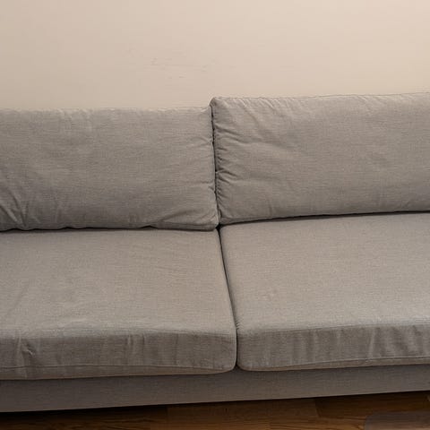 2-sitsig (kanske 2,5) bäddsoffa från Mio, ca 10år gammal. Vi tror att det är en äldre modell av Lindö. Bäddbredd ca 110cm. Färgen är en slags ljus sand. Katt finns i hemmet.