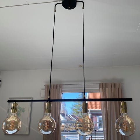 Ellos Rafael taklampa med tre pendlar i svartlackerad metall. Lampan består av tre cylindriska lampskärmar upphängda i textilkablar från en horisontell stång som fästs i taket. Insidan av skärmarna har en varmtonad metallfinish som ger riktat nedåtriktat ljus. Passar över matbord, köksö eller i vardagsrum där samlad belysning önskas. E27‑sockel i varje skärm, ljuskällor ingår normalt inte utan väljs efter önskad ljusstyrka och färgtemperatur.
