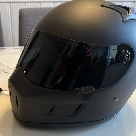 Bild 4 o 5: Lazer integralhjälm, svart stl S. Hjälmen har klart visir och ventilationsöppningar upptill och framtill. Använd 10-15 ggr. Pris: 250:-