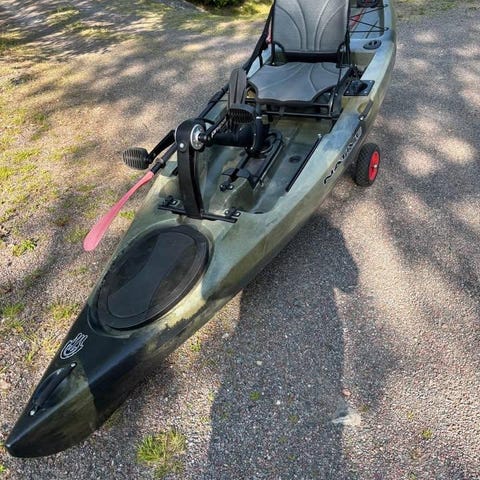 Två löstagbara stolar som gör att man sitter bekvämt, spöhållare, två vattentäta förvaringsbrunnar och två hopfällbara dubbelpaddlar.