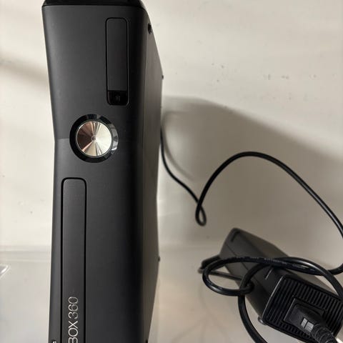 Microsoft Xbox 360 spelkonsol i svart färg. Konsolen visas tillsammans med två trådlösa handkontroller, nätadapter och Kinect-sensor. Xbox 360 är en stationär spelkonsol som kan användas för tv-spel, film- och medieuppspelning samt onlinespel via internetanslutning. Passar för användning med kompatibla Xbox 360-spel och tillbehör.