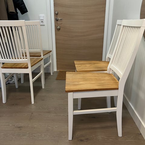 Vita ben på både stolar och bord samt vita detaljer under bordskivan. Stolarna har vita ryggar.