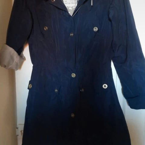 Jätte snygg Desigual kappa för dam i storlek 38. Svart färg med tonat mönster och kontrastsömmar.. Modellen är knälång med dubbelknäppning framtill, krage och fickor. Insidan har mönstrat foder. Passar som ytterplagg under svalare årstider.