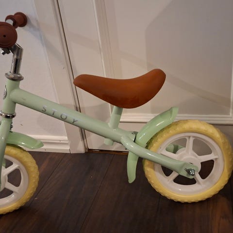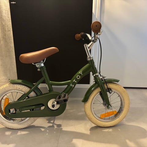 Springcykel i fin grön färg. Cykeln har punkteringsfria skumdäck, fotstöd och stödben. Sparsamt använd av ett barn, däcken och fotstödet har lite märken men inget som påverkar funktionen.
