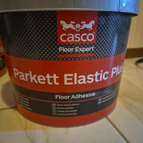 Casco Parkett Elastic Comfort golvlim i färgen beige. Avsett för limning av parkett- och trägolv. Förpackningen är märkt med bäst före-datum 06/2026.