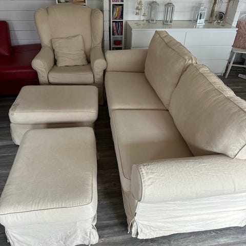 Soffgrupp i mörkgrön sammet bestående av soffa, fåtölj och fotpall. Möblerna har stoppade sitt- och ryggdynor samt mörka ben med mässingsfärgade hjul framtill. Passar som sittgrupp i vardagsrum eller liknande utrymme där man önskar en sammanhållen stil mellan soffa, fåtölj och fotpall.