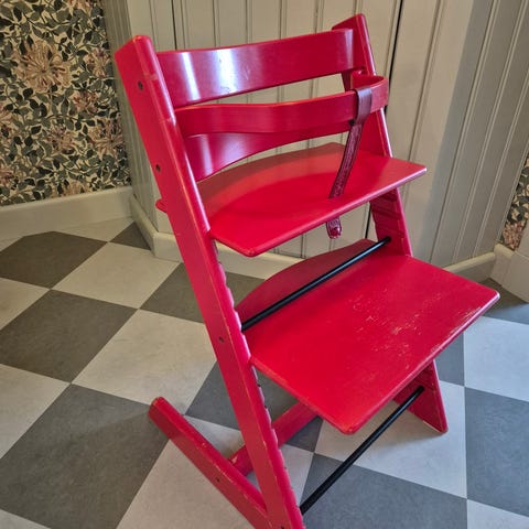 Stokke Tripp Trapp barnstol i vinröd/rosa målat trä. Stolen har justerbar sittyta och fotplatta som kan anpassas efter barnets längd. Klassisk konstruktion med stabil träbas och medar som ger bra stöd vid användning vid bord eller skrivplats. Passar som matstol eller sittstol för barn i olika åldrar beroende på montering och tillbehör som kan köpas separat om så önskas.