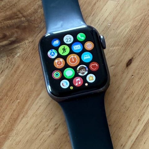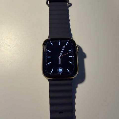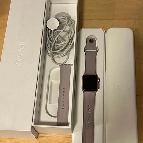 Apple Watch smartklocka i svart färg med rektangulär pekskärm. Klockan har ett svart metallnätarmband med magnetlås, som dock börjar bli utslitet så skulle behöva ett nytt band. Passar för vardagsanvändning och träning, med funktioner som tidsvisning, notifieringar och aktivitetsmätning beroende på modell och programvara som används. Finns smårepor på skärmen som syns om man kollar extremt noga och litet färgsläpp som syns på bilden , men inget som stör funktionen. Inga skambud!