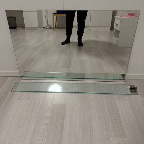 Väggskåp med två dörrar i frostat glas och ram i metallfärg. Skåpet har flera justerbara hyllplan i vitt som ger god översikt och förvaring. Passar till förvaring av allt du har i badrummet.