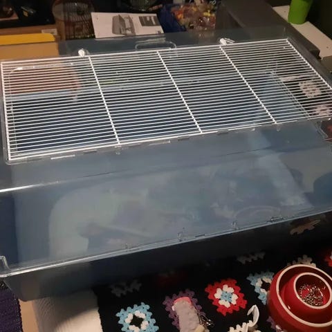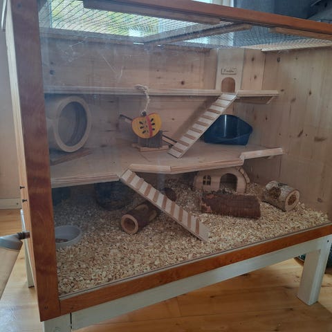 Dvärghamsterbur med tillbehör. Bur i skåpmodell med gallerfront upptill och genomskinlig nedre del. I buren finns bland annat vattenflaska, matskålar och lektillbehör.