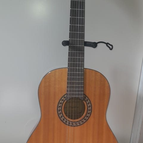 Lugnås Studio akustisk gitarr i fantastiskt skick säljes. Nysträngad med nylonsträngar och med ett nytt gitarrställ. Även en gitarrbok för nybörjare medföljer. Säljes p.g.a att jag tröttnat att spela på den. Finns i Växjö.
