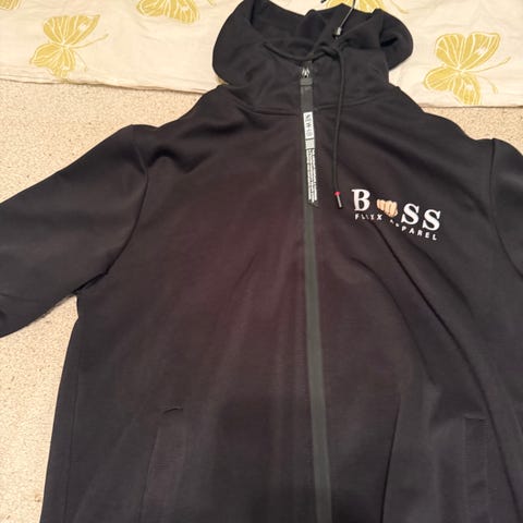 Hugo Boss huvtröja för herr i storlek L. Tröjan är svart med dragkedja framtill och huva med dragsko. Kontrastdetaljer i gult längs dragkedjan och på ärmarna samt BOSS-logotyp på bröstet och i nacken. Material enligt tvättrådslapp (se bild) och tvättråd med symboler finns angivna på insidan. Passar som vardagströja eller överdragströja vid fritidsaktiviteter.