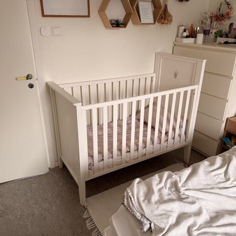 Troll spjälsäng i vit färg. Klassisk spjälsäng med ribbotten och spjälor runtom för säker sovplats för små barn. Ena långsidan går att skjuta ner så den går att ha mot en säng t.ex.