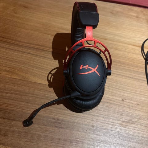 HyperX gamingheadset och tangentbord, mekaniskt. Trådlöst Headset med mikrofon, over-ear-modell i svart och röd färg, anpassat för spel. Kabelanslutet tangentbord i fullstorlek med numerisk del i svart utförande, lämpligt för stationär datoranvändning och gaming.