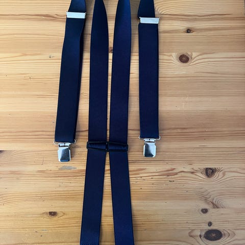 Hängslen för herr i mörkblått randigt band. Justerbara remmar med metallspännen för att fästa i byxlinningen. Passar till vardags- och festklädsel där man vill hålla byxorna på plats på ett praktiskt sätt.