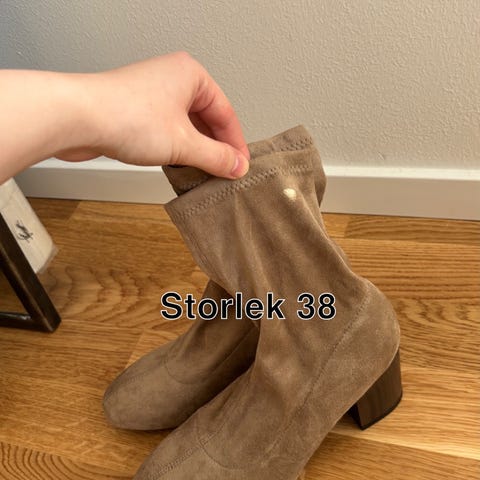 Höga stövlar med klack i mockaliknande material. Storlek 39. Använda 1 gång. 50kr