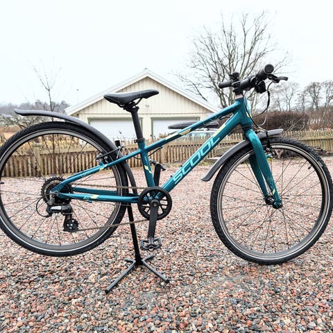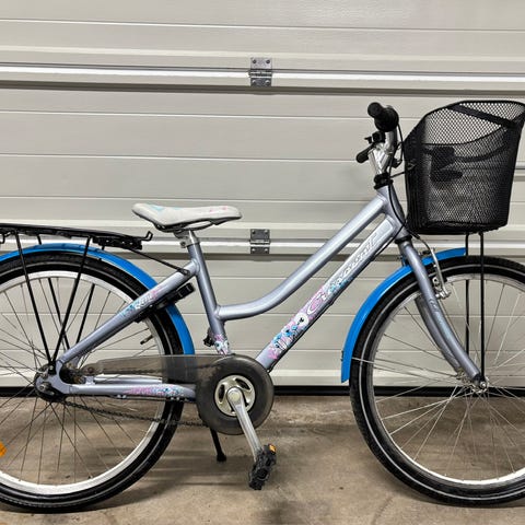 Crescent barncykel med 24" hjul. Cykeln har vinröd ram med ljusa däckkanter, rakt styre och handbroms.