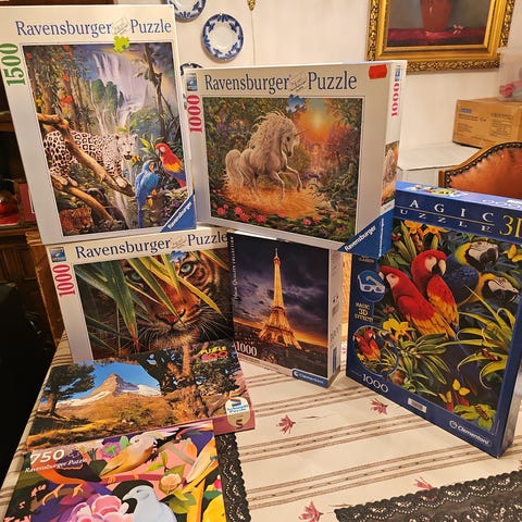 Blandning av pussel med motiv av djur och natur. På bilderna syns flera olika pussel med bland annat leopard, hundvalpar, katt och naturmotiv. Pusslen ligger i sina originalförpackningar. Lämpliga för pusselintresserade i olika åldrar och kan användas både enskilt och tillsammans i grupp som avkopplande aktivitet.