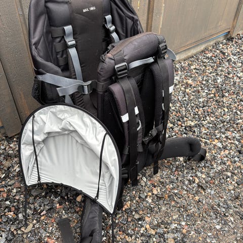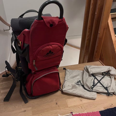 Bärstol för barn i blått tyg. Utrustad med sittdel för barn, vadderade axelremmar och midjebälte för bäraren. Ställning i metall som ger stabilitet vid av- och påtagning. Flera fickor på sidorna och nedtill för förvaring av mindre saker vid promenader och utflykter. Klarar barn upp till ca 15 kg. Bra skick.