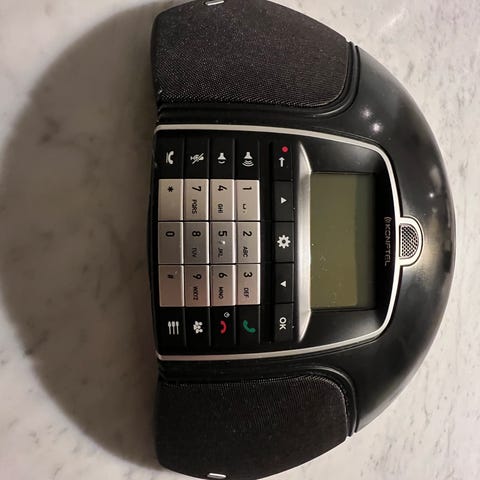 Konftel OmniSound 60W konferenstelefon med två extra bordsmikrofoner och tillhörande kablar. Komplett med nätadapter och många extra kablar. Ansluts via Bluetooth eller sladd.