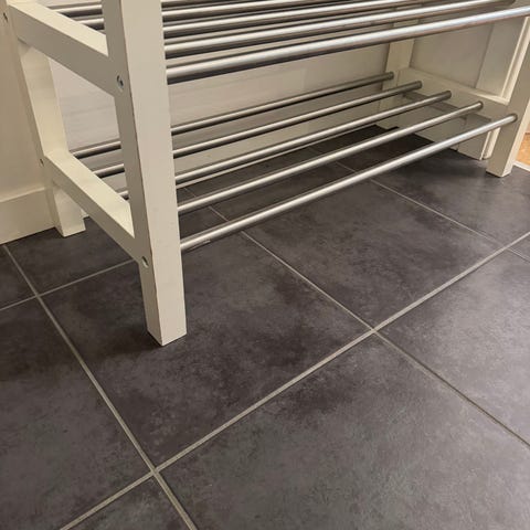 Säljer en praktisk skohylla från IKEA i vitt trä med metallstänger. Perfekt i hallen för att hålla ordning på skor.