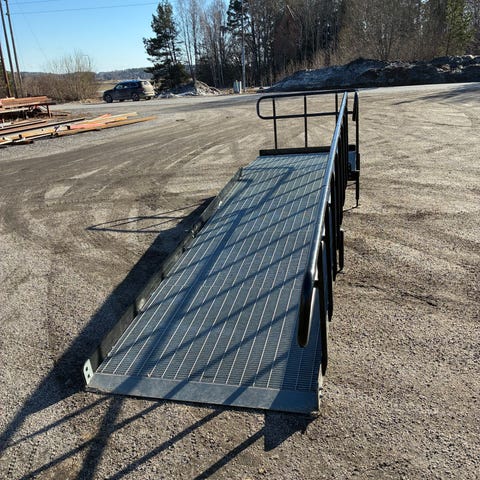 Modulär rullstolsramp i aluminium för utomhusbruk. Systemet består av flera raka ramper och viloplan med halkskyddad, perforerad gångyta och rörformade räcken på båda sidor. Konstruktionen är fristående och placerad från altan/entré ned till marknivå med svängar och nivåskillnader. Lämplig för rullstol, rollator och annan gånghjälp vid bostad eller liknande miljöer. Rampsektionerna är monterade på benstöd som kan anpassas efter underlaget. Går även att använda som byggställning eller ramp för motorcykel till släp osv. Inköpt och monterat för två år sedan för ca 200 000kr .säljs nermonterad pris ide 25 000kr eller vettiga bud.