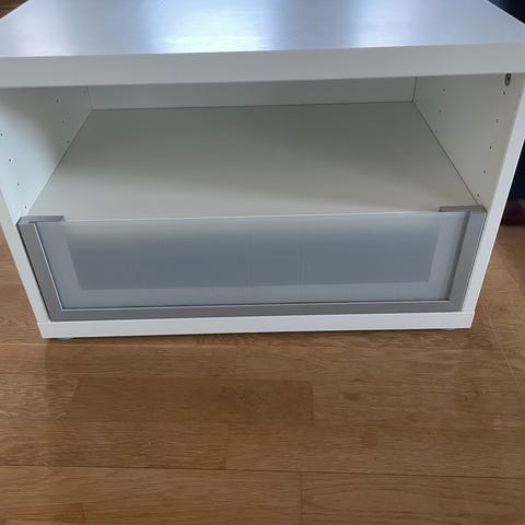 Ikea förvaringsmöbel med öppen hylla och låda i nederdelen. Möbeln är vit med runda ben och en låda med front i frostat material. Passar exempelvis som sängbord, sidobord eller liten förvaringsenhet i sovrum, vardagsrum eller hall.