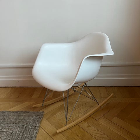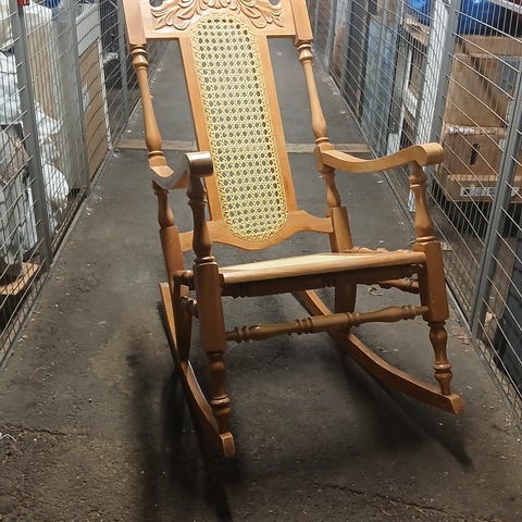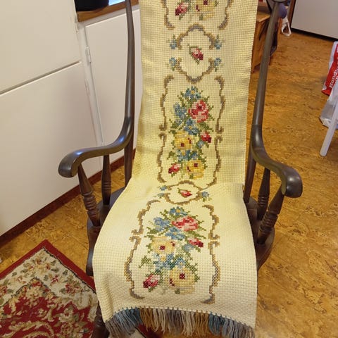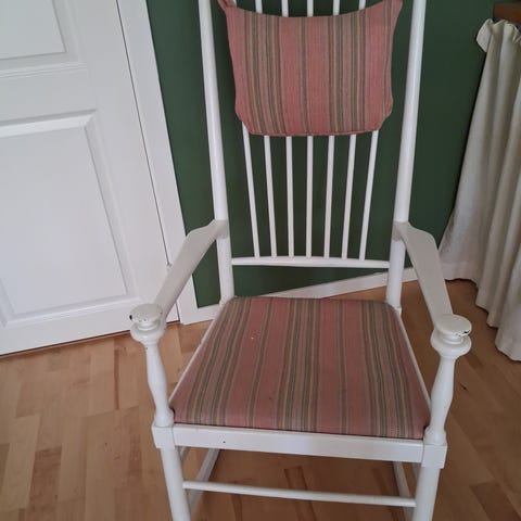 Ommålad gammal gungstol som gungar härligt. Behöver hanteras med kärlek.