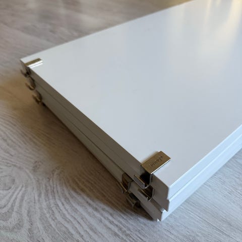 Fyra String hyllplan i vitt utförande formgivna av Nils Strinning. Hyllplanen är avsedda för montering i String-hyllsystem och har metallbeslag på kortsidorna för upphängning i gavlar. Observera att inga gavlar medföljer. Eventuella mindre märken och bruksspår kan förekomma enligt bilderna.