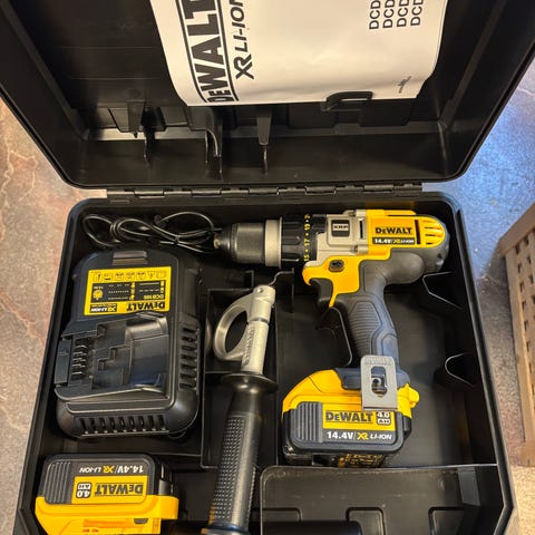 DEWALT DCD985, batteridriven, borr, skruv och slagborrmaskin i ett, inbyggd ledlampa, tre batterier totalt, laddare, fulltfungerande.