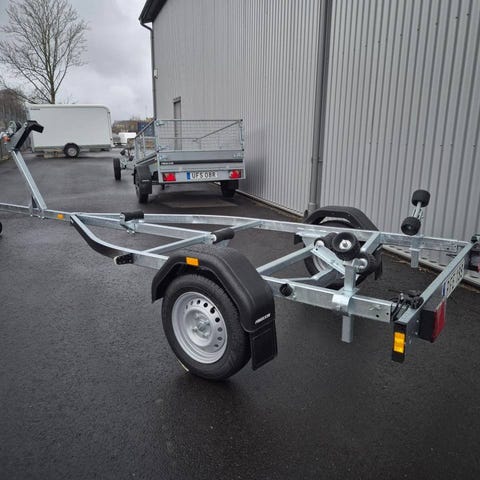 Bromsad trailer för båtar upp till 18 fot. Utrustad med V-formad dragstång och väldigt goda köregenskaper. Tippbar bakre vagga och justerbara och dubbla sidorullar av hög kvalitet för att enkel anpassning till din båt. Varmgalvaniserat chassi för lång hållbarhet. Elen är helt skyddad i båttrailerns chassi. Vattentäta hjullager förlänger livstiden. Justerbart vinschtorn. Enkel avtagbar ljusramp med quick-release-fästen för smidig av- och pålastning. Båttrailern på bilden kan vara extrautrustad.