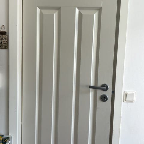 Vit innerdörr i trä med fyra rektangulära speglar.